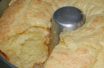 A massa é feita de forma tradicional, misturando todos os ingredientes e assando em forno pré-aquecido até ficar dourado e macio.