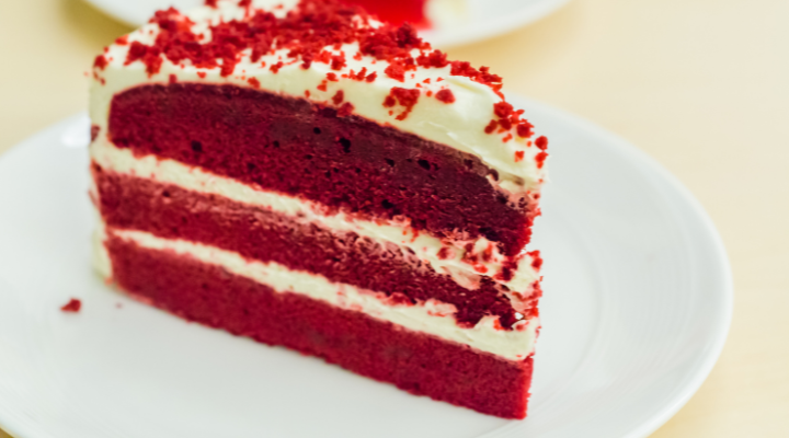 Depois, adicione mais corante vermelho à mistura e use-a para cobrir a próxima camada do bolo, até que a parte superior do bolo fique completamente vermelha.
